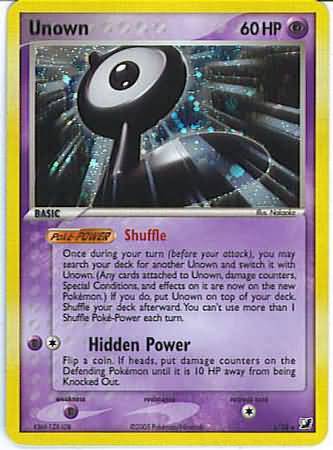 Once during your turn (before your attack), you may search your deck for another Unown and switch it with Unown. (Any cards attached to Unown, damage counters, Special Conditions, and effects on it are now on the new Pokémon.) If you do, put Unown on top of your deck. Shuffle your deck afterward. You can't use more than 1 Shuffle Poké-Power each turn.