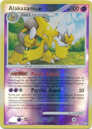 Once during your opponent's turn, when your opponent's Pokémon uses any Poké-Power, you may discard 2 cards from your hand and prevent all effects of that Poké-Power. (This counts as that Pokémon using its Poké-Power.) This power can't be used if Alakazam is affected by a Special Condition.