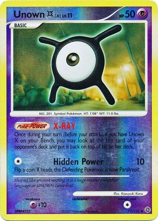 Once during your turn (before your attack), if you have Unown X on your Bench, you may look at the top card of your opponent's deck and put it back on top of his or her deck.