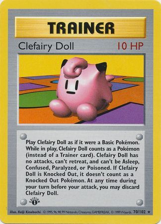 Play Clefairy Doll as if it were a Basic Pokémon. While in play, Clefairy Doll counts a a Pokémon (instead of a Trainer card). Clefairy Doll has no attacks, can't retreat, and can't be Asleep, Confused, Paralyzed, or Poisoned. If Clefairy Doll is Knocked Out, it doesn't count as a Knocked Out Pokémon. At any time during your turn before your attack, you may discard Clefairy Doll.