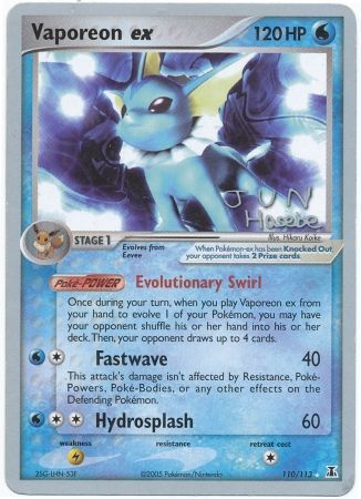 Once during your turn, when you play Vaporeon ex from your hand to evolve 1 of your Pokémon, you may have your opponent shuffle his or her hand into his or her deck. Then, your opponent draws up to 4 cards.