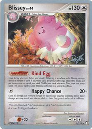 Once during your turn (before your attack), if Happiny is anywhere under Blissey, you may choose a number of cards in your hand up to the amount of Energy attached to Blissey and put those cards on top of your deck. Shuffle your deck afterward. Then, draw that many cards. This power can't be used if Blissey is affected by a Special Condition.