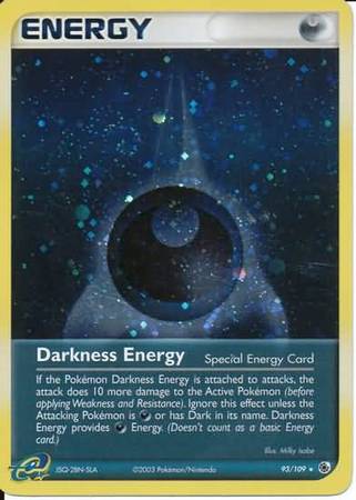 If the Pokémon Darkness Energy is attached to attacks, the attack does 10 more damage to the Active Pokémon (before applying Weakness and Resistance). Ignore this effect unless the Attacking Pokémon is Darkness or has Dark in its name. Darkness Energy provides Darkness Energy. (Doesn't count as a basic Energy card.)