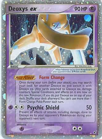 Once during your turn (before your attack), you may search your deck for another Deoxys ex and switch it with Deoxys ex. (Any cards attached to Deoxys ex, damage counters, Special Conditions, and effects on it are now on the new Pokémon.) If you do, put Deoxys ex on top of your deck. Shuffle your deck afterward. You can't use more than 1 Form Change Poké-Power each turn.