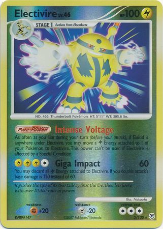 As often as you like during your turn (before your attack), if Elekid is anywhere under Electivire, you may move a Lightning Energy attached to your Pokémon to Electivire. This power can't be used if Electivire is affected by a Special Condition.