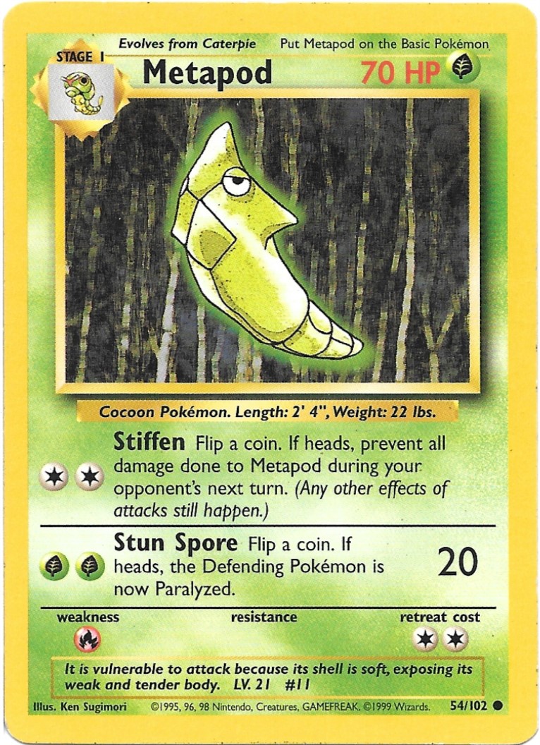 Flip a coin. If heads, prevent all damage done to Metapod during your opponent's next turn. (Any other effects of attacks still happen.)