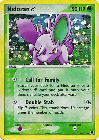 Search your deck for a Nidoran ♀ or Nidoran ♂ card and put it onto your Bench. Shuffle your deck afterward.