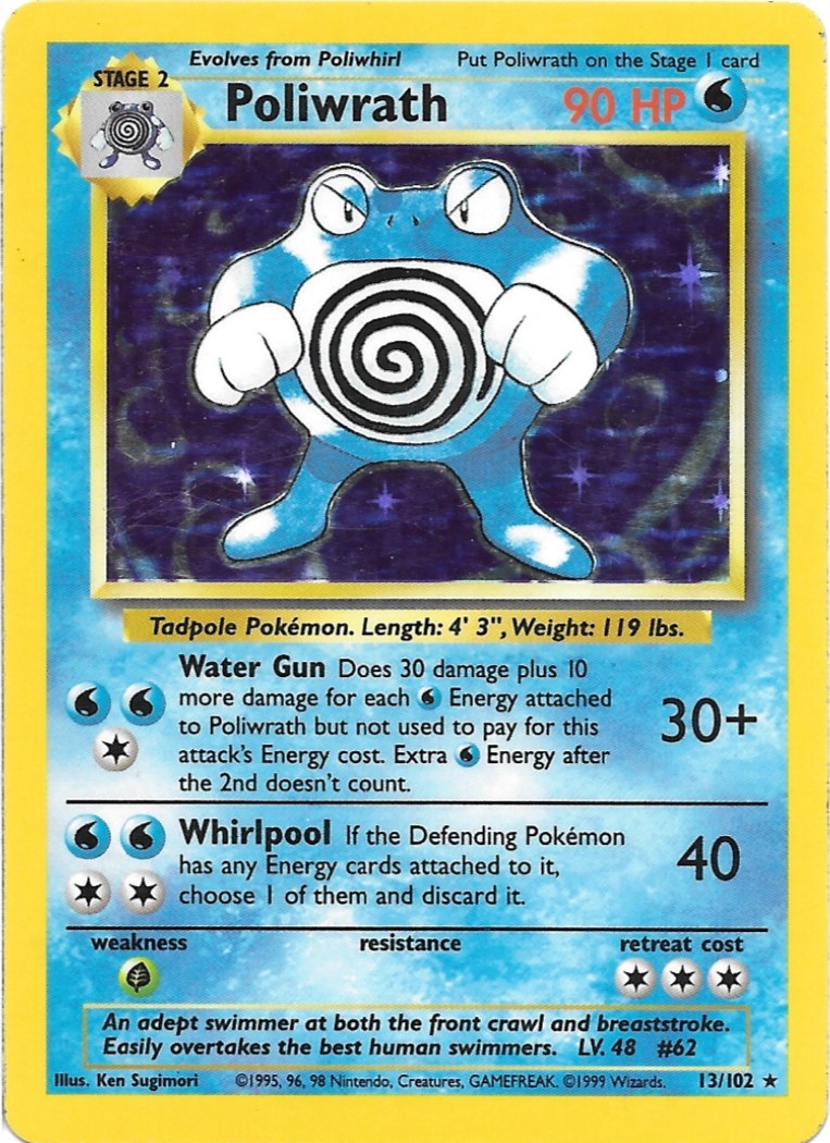 Does 30 damage plus 10 more damage for each Water Energy attached to Poliwrath but not used to pay for this attack's Energy cost. Extra Water Energy after the 2nd doesn't count.