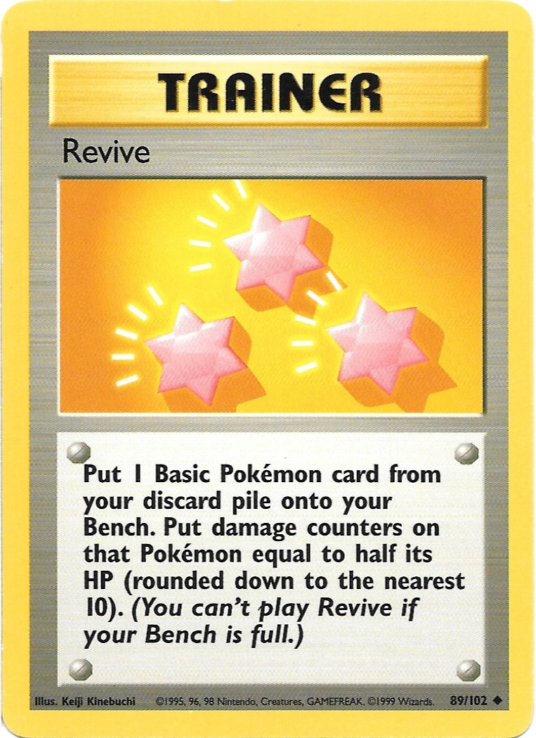 Put 1 Basic Pokémon card from your discard pile onto your Bench. Put damage counters on that Pokémon equal to half its HP (rounded down to the nearest 10). (You can't play Revive if your Bench is full.)
