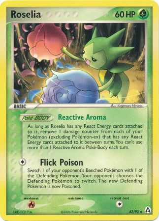 As long as Roselia has any React Energy cards attached to it, remove 1 damage counter from each of your Pokémon (excluding Pokémon-ex) that has any React Energy cards attached to it between turns. You can't use more than 1 Reactive Aroma Poké-Body each turn.